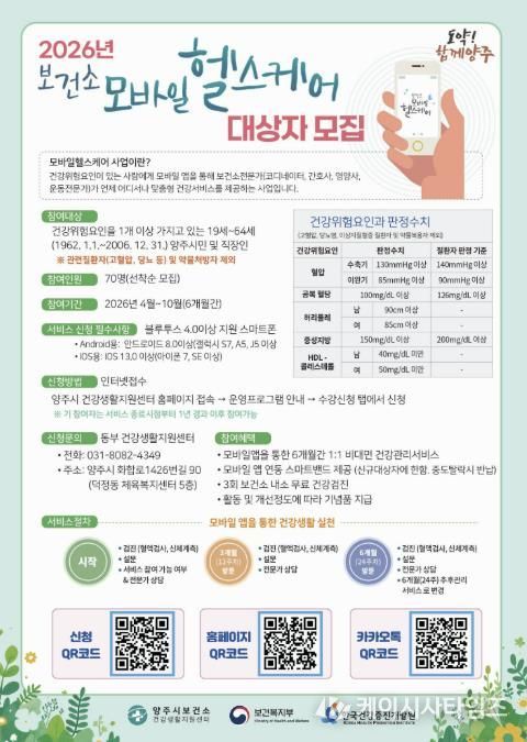 (케이시사타임즈) 양주시보건소 동부 건강생활지원센터가 스마트폰과 활동량계(스마트밴드)를 연동해 시공간의 제약 없이 맞춤형 건강관리를 지원하는 ‘2026년 보건소 모바일 헬스케어 사업’ 참여자를 16일부터 선착순 모집한다.