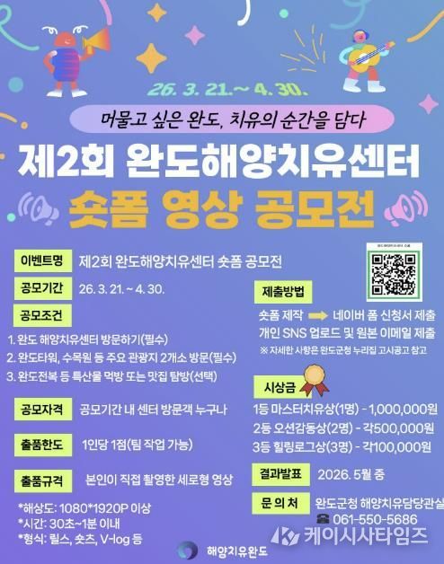 (케이시사타임즈) 완도군은 완도해양치유센터에 대한 국민적 관심을 높이고 치유객 유입을 위해 ‘제2회 완도해양치유센터 숏폼 공모전’을 개최한다.
