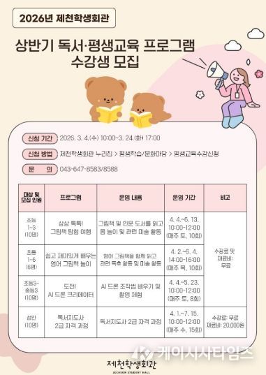 제천학생회관 홈페이지를 통해 프로그램 수강 신청이 가능하며, 접수는 3월 24일까지 진행된다.