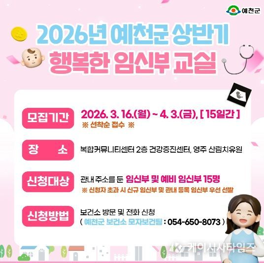 (케이시사타임즈) 예천군은 관내 임신부 및 예비 임신부를 대상으로 ‘2026년 상반기 행복한 임신부 교실’을 운영한다.