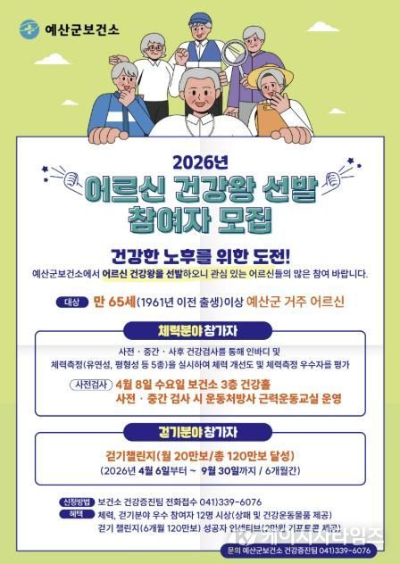 (케이시사타임즈) 예산군보건소는 어르신의 자발적인 신체활동 참여를 유도하고 건강한 노후생활을 지원하기 위해 ‘2026년 어르신 건강왕 선발’ 참가자를 모집한다고 밝혔다.