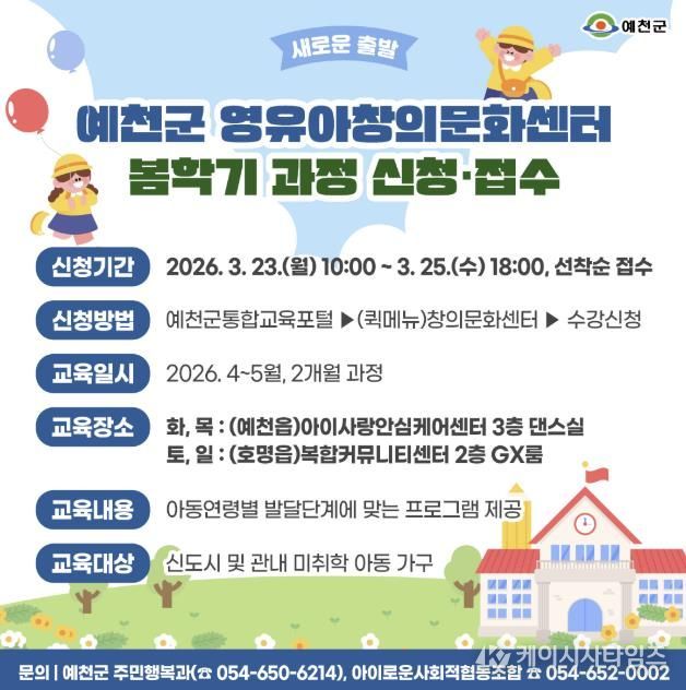 (케이시사타임즈) 예천군은 관내 영유아의 건강한 성장과 창의력 발달을 지원하기 위해 예천군 영유아 창의문화센터 봄학기 프로그램 수강생을 모집한다.