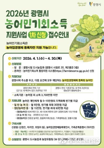 (케이시사타임즈) 광명시는 오는 4월 1일부터 4월 30일까지 ‘농어민 기회소득 지원사업 1차’ 신청을 받는다.