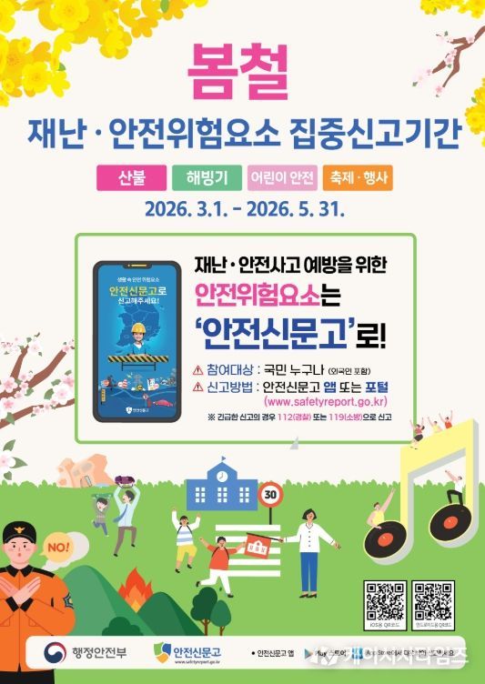 주요 신고 대상은 ▲산불 (불법 취사·소각, 담배꽁초 투기, 전기 시설 손상) ▲해빙기 안전 (포트홀, 옹벽·축대·교량 파손, 산사태·낙석 위험) ▲어린이 안전 (보호구역 안전시설 및 놀이시설 파손) ▲축제·행사 (인파 밀집 우려, 행사장 시설물 파손) 등이다.
