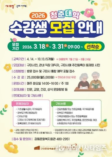 (케이시사타임즈) 구미시강동문화복지회관은 3월 18일부터 3월 31일까지 ‘청춘대학’ 수강생을 모집한다.