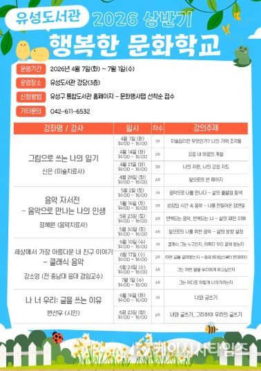 (케이시사타임즈) 대전 유성구는 4월부터 7월까지 주민의 문화 향유 기회를 확대하고 정서적 치유를 지원하기 위한 ‘2026년 상반기 행복한 문화학교’를 운영한다.
