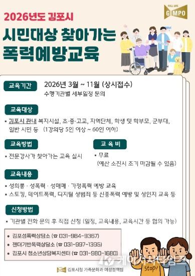 (케이시사타임즈) 김포시는 시민의 건전한 성 가치관 형성과 폭력 예방 의식 확산을 위해 ‘2026년 김포시 시민대상 폭력예방교육’ 사업을 3월부터 11월까지 추진한다고 밝혔다.