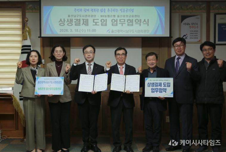 (케이시사타임즈) 울산남구도시관리공단은 18일 농협은행 울산중앙금융센터와 중소기업 상생환경 조성을 위해 상생결제 시스템 도입과 확산을 위한 업무협약을 체결했다.