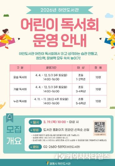 (케이시사타임즈) 광명시 하안도서관은 어린이들이 올바른 독서 습관을 형성하고 기초 문해력을 기를 수 있도록 ‘2026년 어린이 독서회’ 참여 회원을 모집한다.