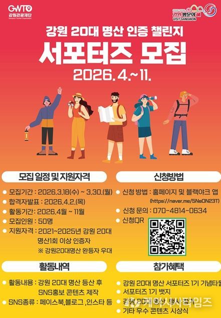 (케이시사타임즈) 강원특별자치도와 강원관광재단은 지난 3월 18일부터 오는 3월 30일까지‘강원 20대 명산 서포터즈 1기를 모집한다고 밝혔다.