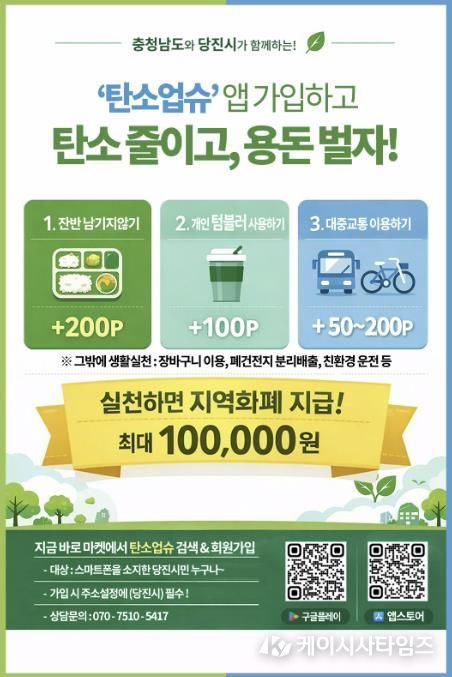 (케이시사타임즈) 당진시는 기후위기 대응을 강화하고 시민들의 자발적인 탄소중립 실천을 확산하기 위해 충남형 탄소중립포인트제 ‘탄소업슈’ 가입자 확대를 본격 추진한다고 19일 밝혔다.