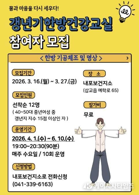 (케이시사타임즈) 예산군 내포보건지소는 갱년기 증상으로 어려움을 겪는 중년 여성의 건강 증진과 삶의 질 향상을 위해 2026년 ‘갱년기 한방건강교실’ 프로그램을 운영한다.