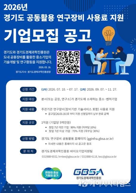 (케이시사타임즈) 경기도와 경기도경제과학진흥원이 도내 중소·벤처기업의 연구개발(R&D) 경쟁력 강화를 위해 ‘2026년 경기도 공동활용 연구장비 사용료 지원 사업’을 추진한다.