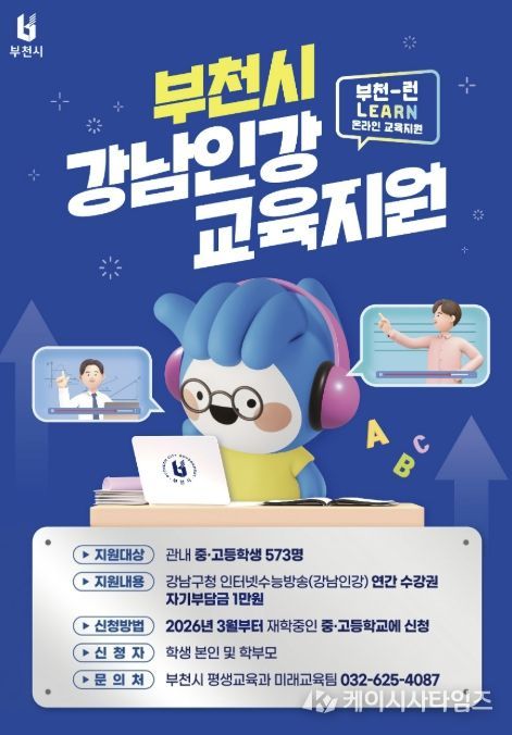 (케이시사타임즈) 부천시는 2026년 ‘부천-런(Learn) 온라인 교육지원’ 사업을 추진한다고 19일 밝혔다. 이는 지난해에 이어 시행되는 것으로, 관내 중·고등학생들에게 온라인 교육 기회를 제공하고 가정의 사교육비 부담을 완화하는 데 중점을 둔다.