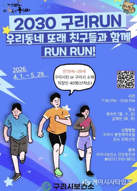 (케이시사타임즈) 구리시는 4월 1일부터 5월 29일까지 2030 청년층의 건강증진과 규칙적인 신체활동 실천을 돕기 위해 왕숙천과 갈매천에서 ‘상반기 2030 구리RUN’ 프로그램을 운영한다고 밝혔다.