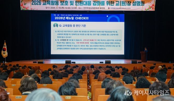 (케이시사타임즈) 전북특별자치도교육청은 19일 전주학생교육문화관 공연장에서 2026년 교육활동 보호 및 민원대응 강화를 위한 학교(원)장 설명회를 개최했다.