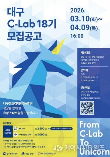 (케이시사타임즈) 대구광역시는 인공지능 전환(AX)을 선도할 혁신 기술 기업과 대구의 미래 전략 신산업을 이끌 유망 스타트업을 발굴하기 위해 ‘대구 C-Lab 액셀러레이팅 18기’ 참여기업을 오는 4월 9일까지 모집한다.