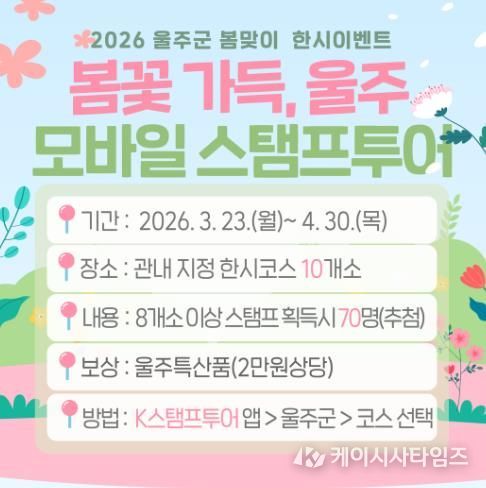 올해 새롭게 리뉴얼된 K스탬프투어 모바일 앱을 이용한 ‘봄꽃 가득, 울주’ 이벤트와 ‘울주와봄’ SNS 여행후기 인증 이벤트 등으로 구성됐다.