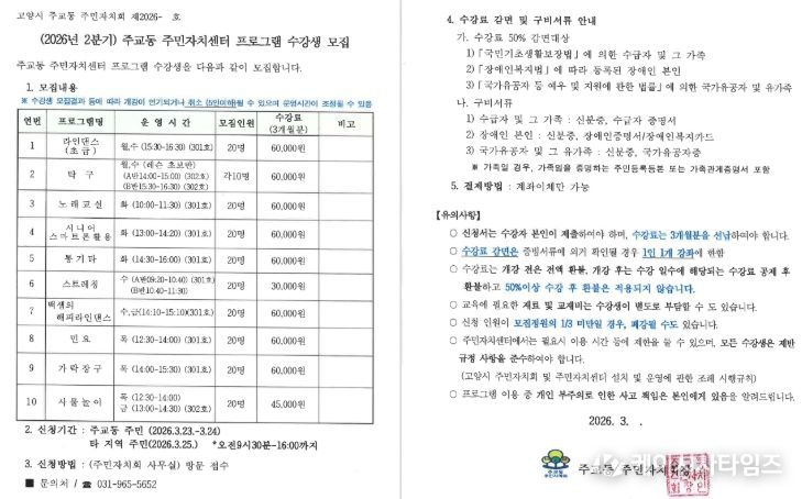 (케이시사타임즈) 고양특례시 주교동 주민자치회는 오는 3월 23일부터 25일까지, 2분기 주민자치센터 문화강좌 프로그램 수강생을 모집한다.