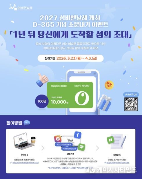 (케이시사타임즈) 섬비엔날레조직위원회는 3월 23일부터 4월 3일까지 약 2주간 섬비엔날레 개최 D-365일을 맞아 대국민 온라인 참여 이벤트를 진행한다고 밝혔다.