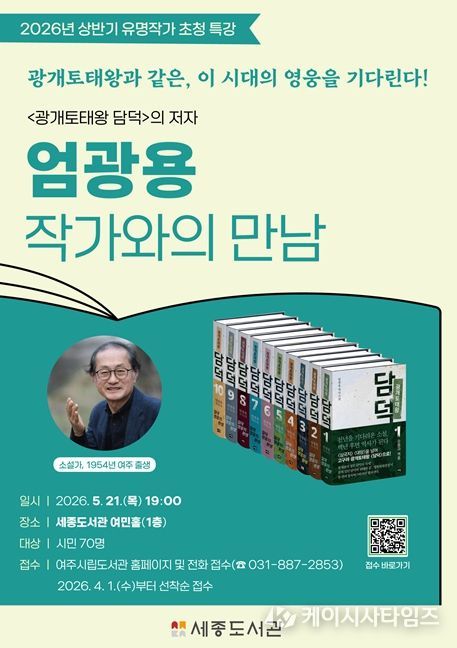(케이시사타임즈) 여주시는 오는 5월 21일 오후 7시 세종도서관에서 대하소설 '광개토태왕 담덕'의 저자, 엄광용 작가를 초청하여 작품과 작가의 세계관에 대해 시민들과 이야기하는 ‘엄광용 작가와의 만남’을 운영한다.