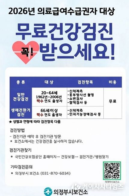 (케이시사타임즈) 의정부시 보건소는 의료급여수급권자 및 건강보험가입자의 질병 조기 발견과 건강관리를 위해 2026년 국가 일반건강검진을 실시한다.
