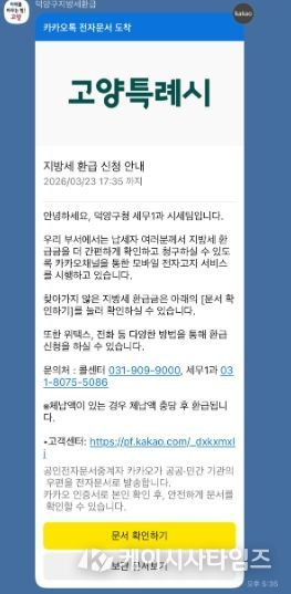 (케이시사타임즈) 고양특례시 덕양구는 23일 오늘 지방세 환급금을 수령하지 않은 납세자를 대상으로 카카오 알림톡(채널명: 덕양구지방세환급)을 발송해 환급금 조회 및 신청 방법을 안내할 예정이다.