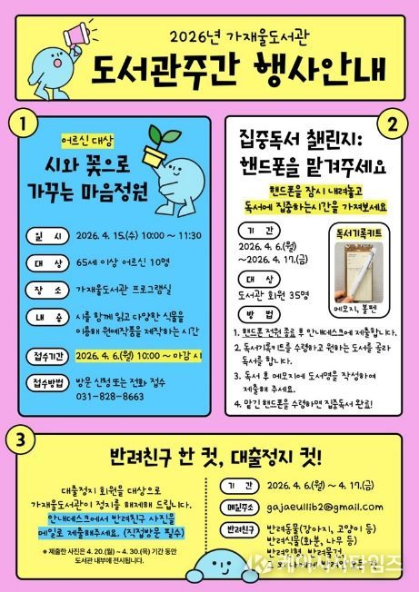 이 외에도 대출정지 회원을 위한 이벤트 ‘반려친구 한 컷, 대출정지 컷!’도 진행한다. 반려친구 사진을 이메일로 제출하면 대출정지를 해제하는 행사로, 반려친구의 범위는 반려동물뿐만 아니라 반려식물, 반려인형, 반려물건 등 개인에게 의미 있는 대상까지 폭넓게 포함한다. 자세한 사항은 도서관 누리집을 참고하거나 가재울도서관(031-828-8663)으로 문의하면 안내받을 수 있다.