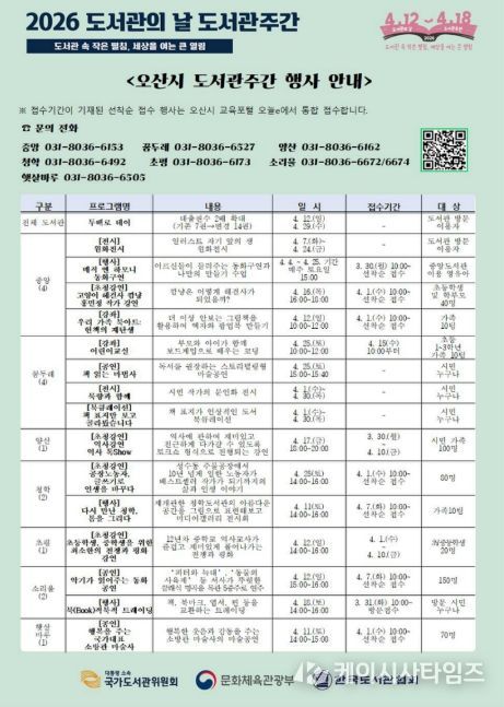(케이시사타임즈) 오산시는 2026년 도서관의 날(4월 12일)과 도서관주간(4월 12일~4월 18일)을 맞아 시민 누구나 참여할 수 있는 다양한 독서문화 행사를 운영한다고 밝혔다.