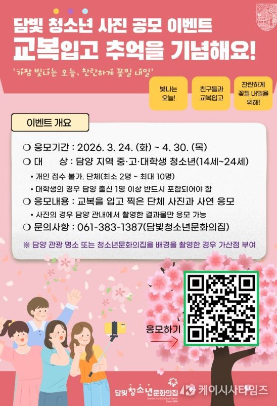 군 관계자는 “청소년들이 친구들과 함께 담양의 다양한 공간에서 사진을 촬영하며 지역의 매력을 자연스럽게 경험하길 바란다”며 “이번 공모전이 소중한 추억을 만들고 지역 문화를 기록하는 의미 있는 기회가 되길 기대한다”라고 전했다.