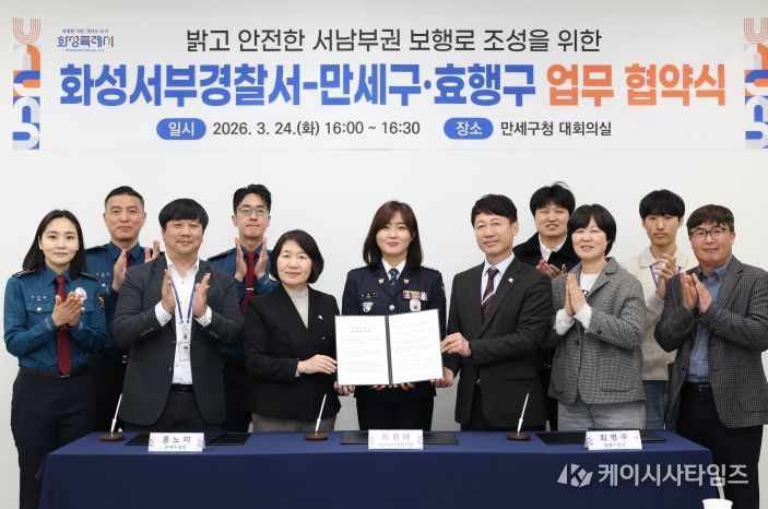 (케이시사타임즈) 화성특례시 만세구는 24일 만세구청 대회의실에서 화성서부경찰서, 효행구청과 함께 ‘밝고 안전한 서남부권 보행로 조성을 위한 업무협약(MOU)’을 체결했다고 밝혔다.
