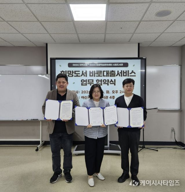 (케이시사타임즈) 아산시 시립도서관은 24일 우리서점, 탕정서점과 ‘희망도서 바로대출’ 서비스 운영을 위한 업무협약을 체결했다고 밝혔다.