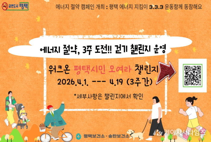 평택보건소 관계자는 “최근 에너지 가격 상승으로 시민들의 부담이 커진 상황이지만, 일상 속 한 걸음 한 걸음이 지구 환경을 지키고 나의 건강 수명을 늘리는 가장 소중한 실천 방법”이라며, “이번 챌린지를 통해 걷는 즐거움이 곧 에너지 절약 실천으로 이어지는 건강한 생활 문화로 정착되길 바란다”고 전했다.