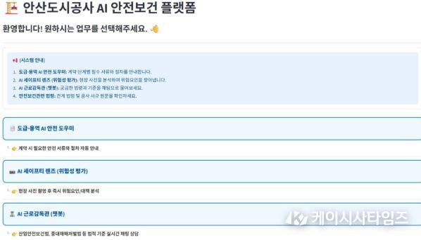 (케이시사타임즈) 안산도시공사는 생성형 인공지능(AI) 기술을 접목한 ‘AI 안전보건 플랫폼’을 자체 개발해 현장 사고 예방 업무에 본격적으로 활용한다고 25일 밝혔다.