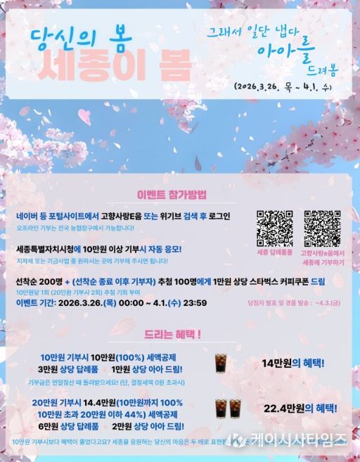 (케이시사타임즈) 세종특별자치시가 봄꽃 개화시기를 앞두고 26일부터 내달 1일까지 일주일간 세종 고향사랑기부제 봄꽃 이벤트 ‘당신의 봄, 세종이 봄’을 진행한다.