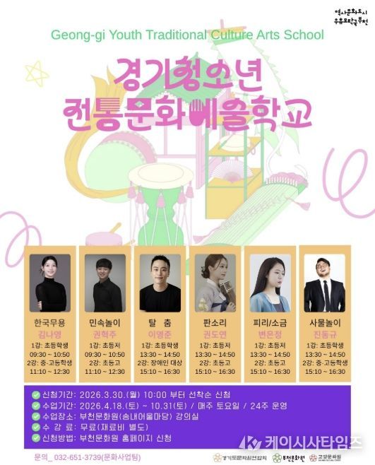 (케이시사타임즈) 부천문화원은 청소년들의 전통문화 참여 기회를 확대하고 경기지역 전통민속예술의 지속 가능한 전승 기반 마련을 위한 ‘2026 경기청소년전통문화예술학교’ 참여 학생을 모집한다.