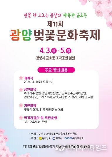(케이시사타임즈) 광양시 금호동은 오는 4월 3일부터 4월 5일까지 금호동 조각공원 일원에서 3일간 제11회 광양벚꽃문화축제를 개최한다고 밝혔다.