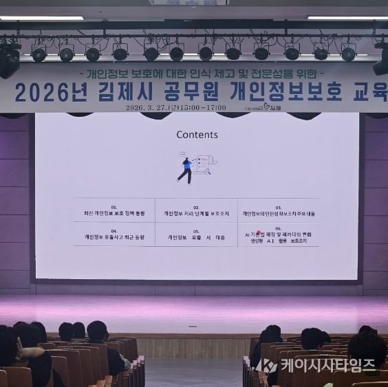 (케이시사타임즈) 김제시는 27일 시청 대강당에서 전 직원을 대상으로 시민의 개인정보를 안전하게 보호하기 위해 외부 전문가를 초청해 ‘상반기 개인정보보호교육’을 실시했다고 밝혔다.