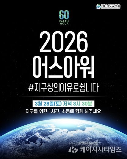 경남교육청은 기후 위기에 대응하고 에너지 절약의 중요성을 알리기 위해 전 세계적으로 진행하는 전등 끄기 캠페인 ‘어스아워(Earth Hour)’에 동참한다고 밝혔다.