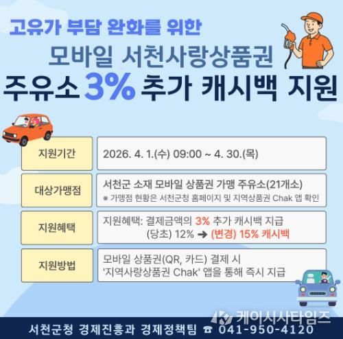 (케이시사타임즈) 서천군이 최근 유가 상승에 따른 군민들의 생활비 부담을 덜기 위해 주유소 이용 시 모바일 서천사랑상품권 추가 캐시백 지원에 나선다.