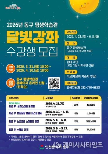 (케이시사타임즈) 인천 동구는 구민들의 학습권과 평생학습 참여 기회를 보장하기 위해 퇴근 후 야간 특화 프로그램‘달빛강좌’수강생을 오는 31일부터 모집한다고 밝혔다.