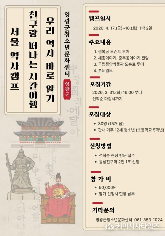 이번 캠프는 오는 4월 17일부터 18일까지 1박 2일간 진행되며, 영광군 관내 초등학교 5학년 청소년 30명을 대상으로 서울의 주요 역사·문화 명소를 탐방한다.