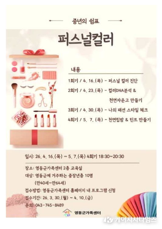 (케이시사타임즈) 충북 영동군가족센터가 중장년층의 자기 이해와 삶의 활력 증진을 위해 ‘중년의 쉼표–퍼스널컬러 프로그램’을 운영한다.