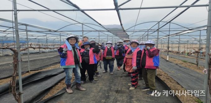 연합회는 최근 농장주 남편이 담낭 제거 수술을 받아 농작업에 어려움을 겪고 있는 김미숙 회원의 포도과원을 찾아 일손 돕기 봉사활동을 펼쳤다.