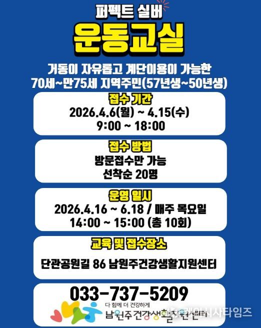 (케이시사타임즈) 남원주건강생활지원센터는 다음 달 16일부터 지역 주민을 대상으로 ‘퍼펙트 실버 운동교실’ 프로그램을 운영한다.