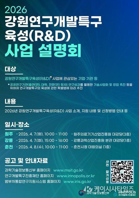(케이시사타임즈) 연구개발특구진흥재단과 강원특별자치도는 ‘2026년 강원연구개발특구육성(R·D) 사업 설명회’를 4월 7일 원주·강릉, 8일 춘천에서 개최한다고 밝혔다.