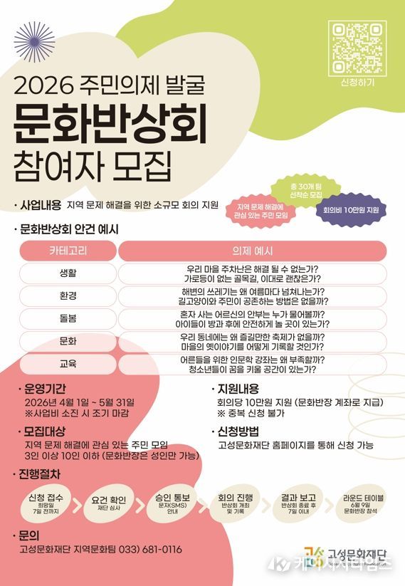 (케이시사타임즈) 고성문화재단은 주민 스스로 지역의 문제를 진단하고 대안을 모색하는 2026 주민의제 발굴 '문화반상회' 참여 모임을 오는 4월 1일 수요일부터 5월 31일 일요일까지 모집한다.
