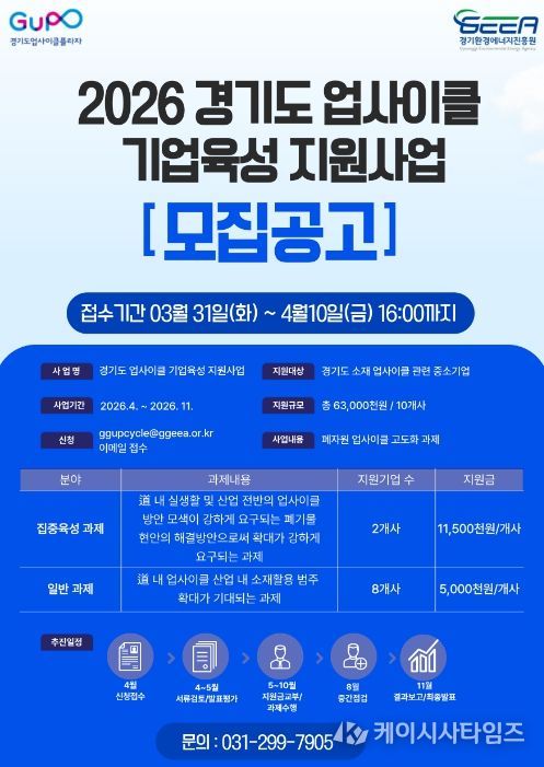 (케이시사타임즈) 경기환경에너지진흥원이 업사이클 기업을 발굴해 기술 고도화와 사업화를 돕는 ‘경기도 업사이클 기업육성 지원사업’ 참여기업을 10일까지 모집한다.