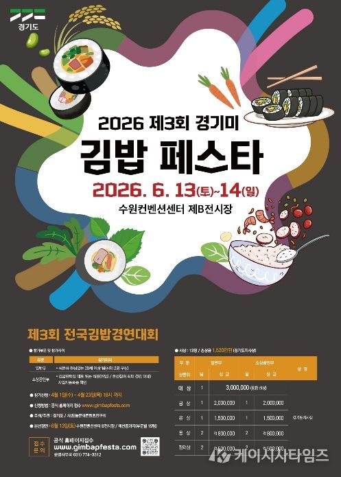 이번 대회는 오는 6월 13일부터 14일까지 수원컨벤션센터에서 개최되는 ‘2026 경기미 김밥 페스타’의 핵심 프로그램이다. 경기도는 4월 1일부터 23일까지 공식 누리집을 통해 참가 신청을 받는다.