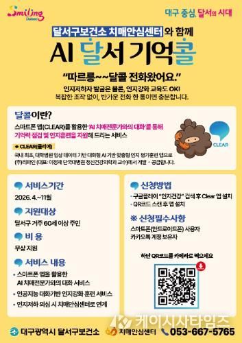 (케이시사타임즈) 대구 달서구는 4월부터 치매 조기발견과 예방을 동시에 지원하는 AI 기반 치매 예방 서비스 ‘AI 달서 기억콜’ 사업을 본격 추진한다.